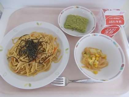 和風スパゲティ 白菜と大根のサラダ おからまっちゃケーキ 牛乳