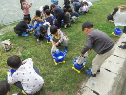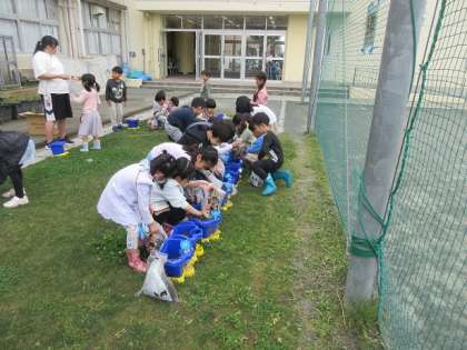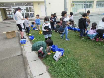 校長室前の芝生に植木鉢を持った1年3組の子ども達が出てきました。