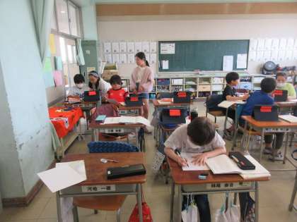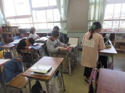 タブレットを使い、春の言葉を確かめながら、俳句を考えています。