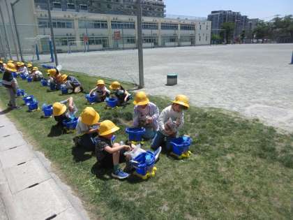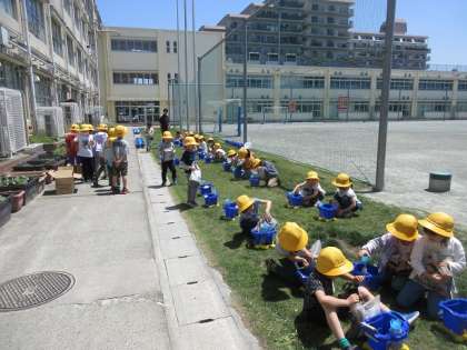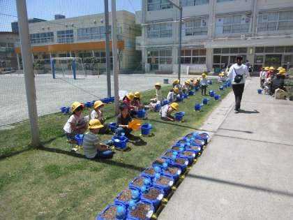 職員室前の芝生に教室でもらった青い植木鉢を持ってきました。