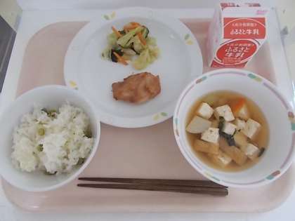 米といっしょにたいたので、皮の部分もやわらかく、おいしいグリンピースご飯でした。