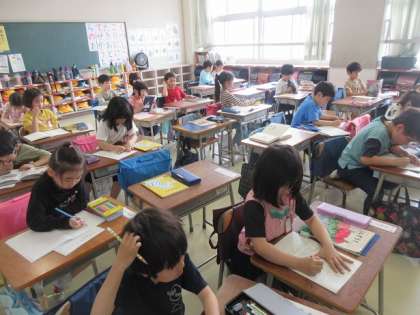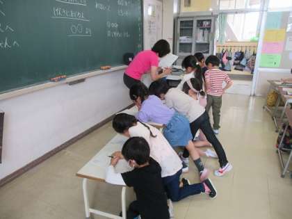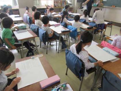 1年生の教室では、運動会号の学年だよりに子ども達がおうち方に向けて手紙を書いています。応援に来てくださるのをも待っています。
