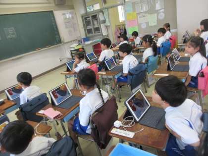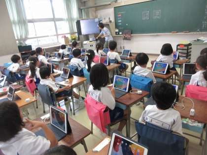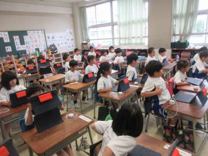 1年1組の教室をのぞくと、子ども達の机の上にはタブレットが開かれています。