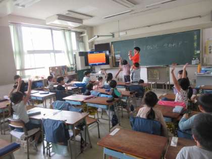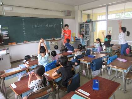 1年2組では、応援団が作成した動画を見ながら、練習をしています。