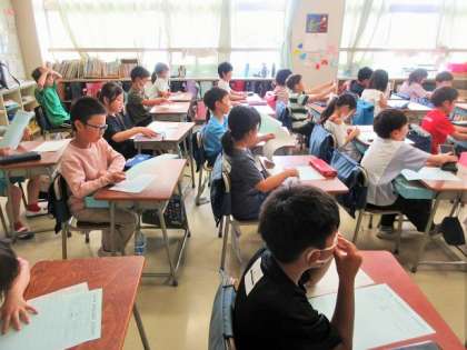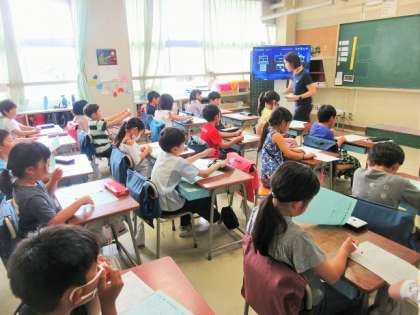 2年1組では、明日の運動会のめあてを考えています。