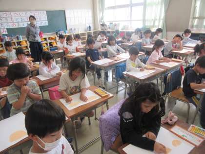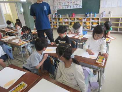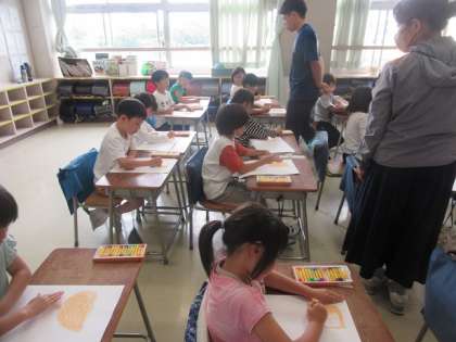 運動会の絵を描いています。自分の顔を大きく描きます。