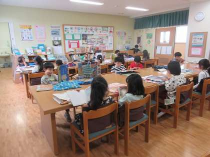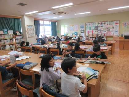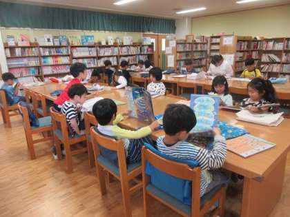 図書室での読書です。本がたくさんあり、静かに読むことができるので、心が落ち着きます。