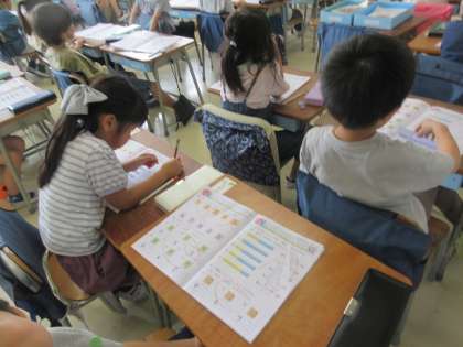 今日はワークブックを使い、これまで学習してきたことを確かめています。