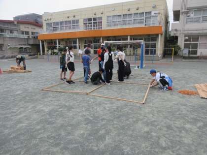 使用するのは、180センチと90センチの細い杉の木、固定に使うにはゴムバンドです。土台になる部分などを丁寧に作っていきます。