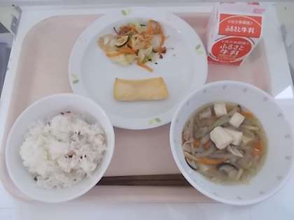 うめごはん いかの照り焼き れんこんチップスサラダ さわにわん 牛乳