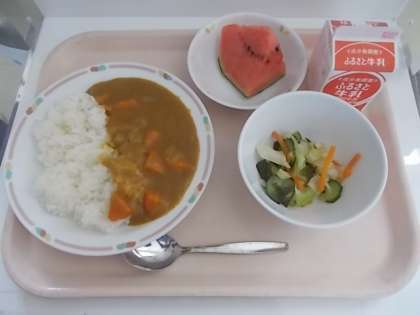 ポークカレーライス わかめサラダ スイカ 牛乳