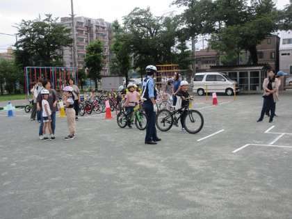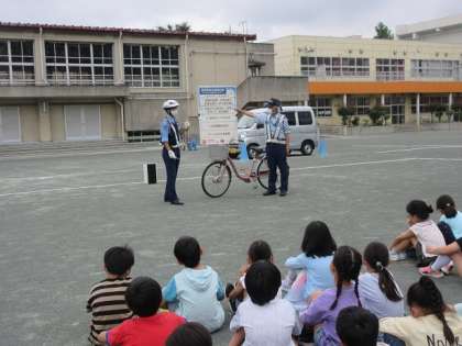 3年生の交通安全教室を行い、成城警察交通課の警察官による、自転車の乗り方に関して学習しました。保護者の皆さんにもご協力いただき、実際に自転車に乗っての体験も出来ました。