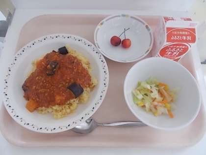 なすのミートライス コーンサラダ さくらんぼ ぎゅうにゅう