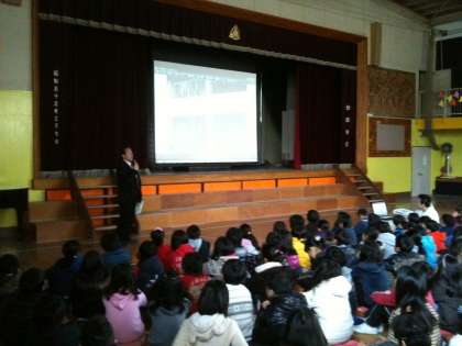 体育館の全校集会で校長先生から、実際に訪問して撮影した、石巻市の写真を見ながら、地震と安全についてお話をいただきました。その後、全学級で、私たちが今できること、その時に備え自分ができることを考えました。今後も、千歳台小学校は石巻市立橋浦小学校、相川小学校、吉浜小学校の支援を引き続き行います。