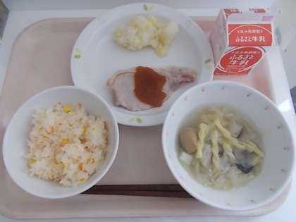 にんじんライス ぶた肉のアップルソースがけ こふきいも マカロニ入りスープ 牛乳
