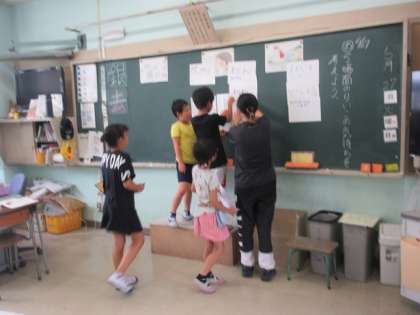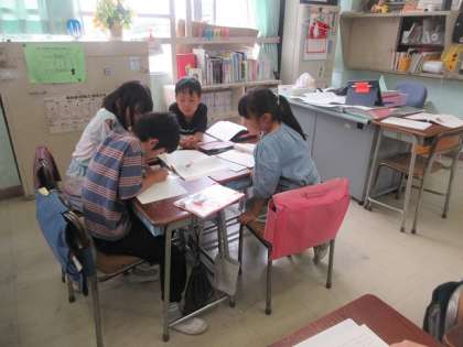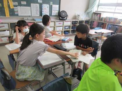 主人公の気持ちを、グループで友だちと相談しながら考え、カードにします。