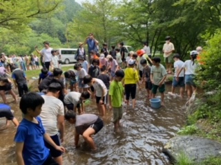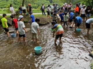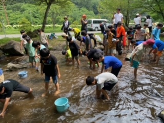 生きているマスの手づかみです。初体験の子も、大にぎわいでの体験です。