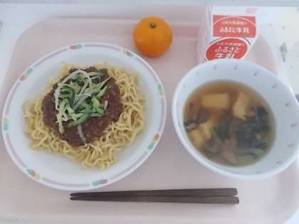 ジャージャーめん 厚あげ入り春さめスープ くだもの(冷とうみかん)