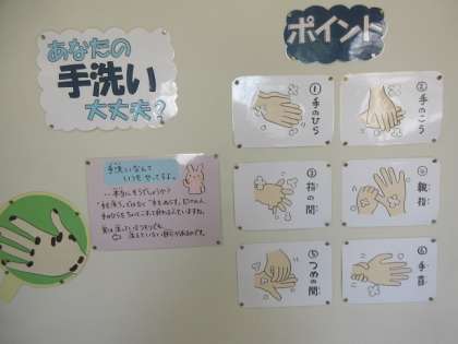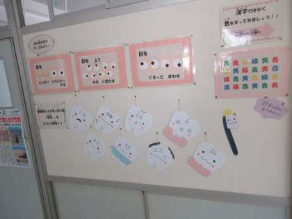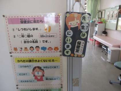 保健室の掲示板には、季節に合わせた健康のテーマが掲示されています。