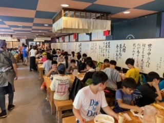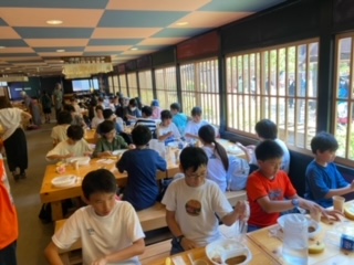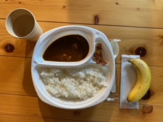 宿舎行事恒例のカレーライスは三日目の昼食のメニューでした。ややスパイシー感があり美味しいです。