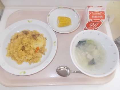 カレーピラフ ベーコンと白菜のスープ 蒸しとうもろこし 牛乳