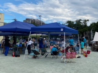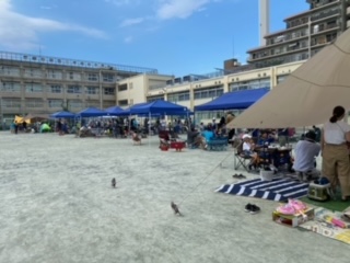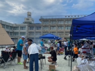 校庭でると、とてもよい匂いがしてきます。各班ごとで、大人と子どもが一緒になって調理中です。