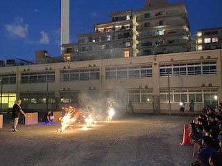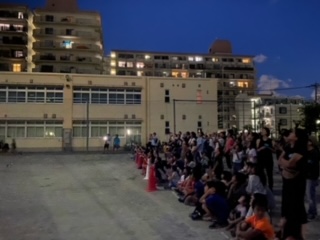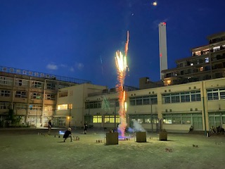 校庭で花火大会。打ち上げ花火に子ども達も大歓声です。