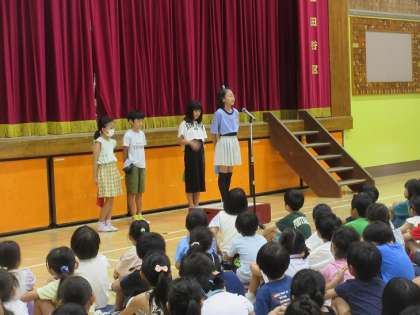 4年生の代表児童が、1学期の振り返りと2学期の目標について発表しました。