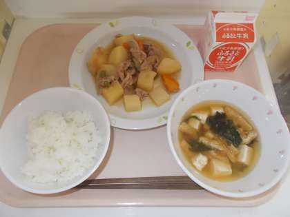 ごはん 肉じゃが 豆腐とわかめの味噌汁 牛乳