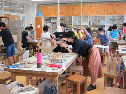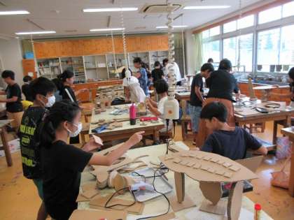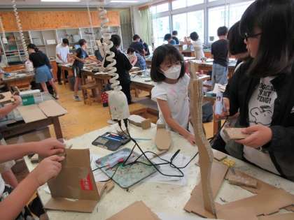 段ボール材料に制作中の椅子ですが、座面や足らしきものが感じられるようになってきています。
