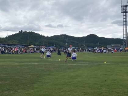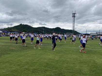 小中合同で、約270人の児童・生徒が、民俗資料館前の芝生グランドで運動会を行っています。午前中最後には、小中学生全員と村長さんをはじめとする村の皆さんが一緒に「川場ばやし」を踊りました。本当に村を挙げての行事でした。