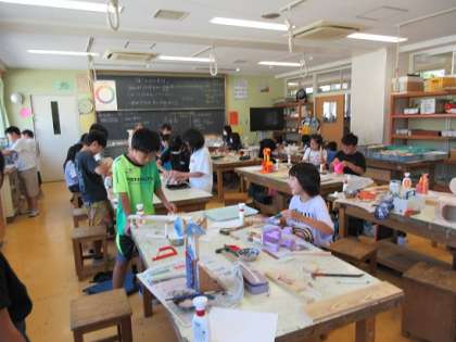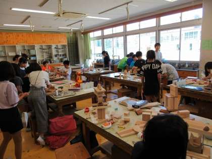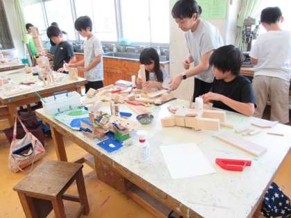 様々な形の木を組み合わせたあと、絵の具を使って色付けをしています。
