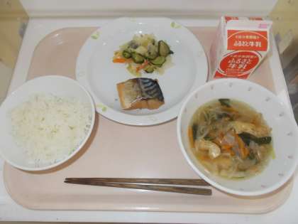 ごはん サバの味噌煮 わかめサラダ 野菜のすまし汁 牛乳