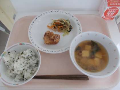 わかめごはん 鶏のから揚げ 海苔和え なめこ入り味噌汁 牛乳