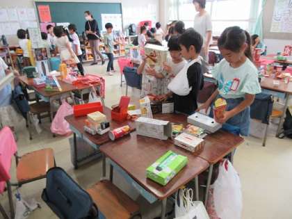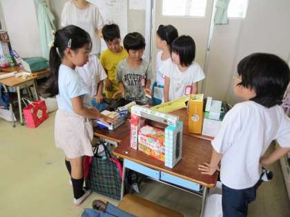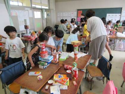 いろいろな形の空き箱の特徴を考えながら、組み立てています。