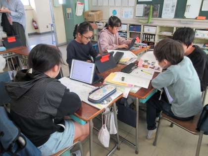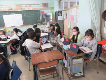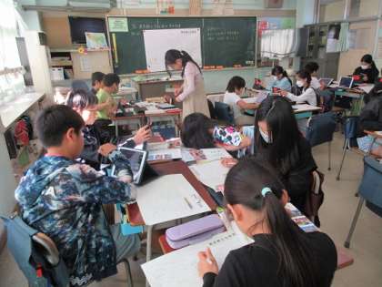 タブレットを使い、東京で古くからおこなわれている祭りを調べています。