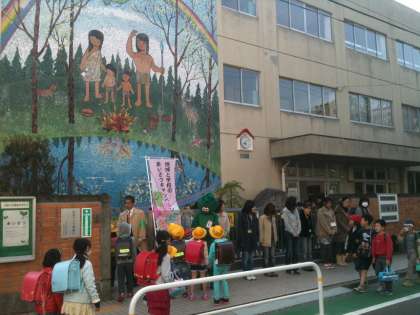 今週は、あいさつキャンペーンです。めばえの会の皆様も、参加していただいています。一年生が見ているのは、「めばえくん」です。