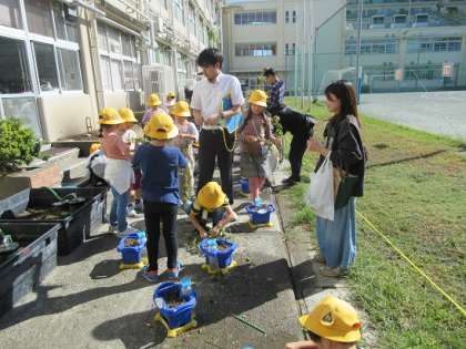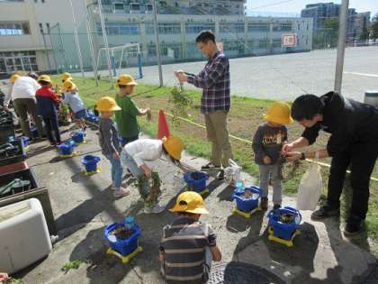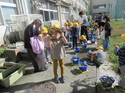 校庭保健室前での作業です。アサガオの蔓をまとめてリースを作りました。