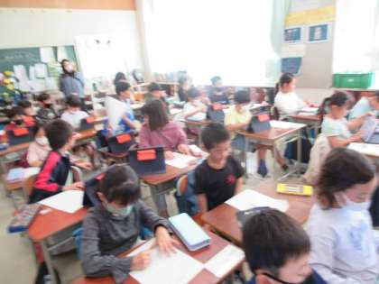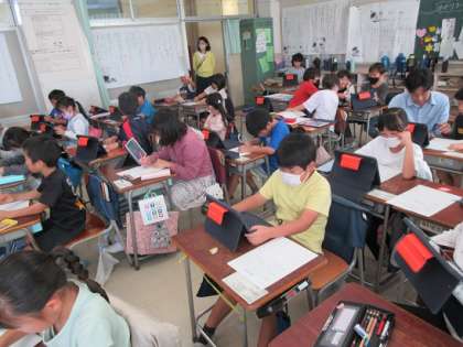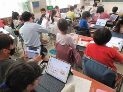 展覧会の作品にするのでしょうか?タブレットを使い、お面のデザインを考えています。