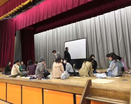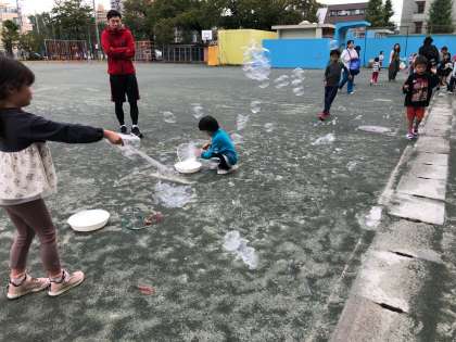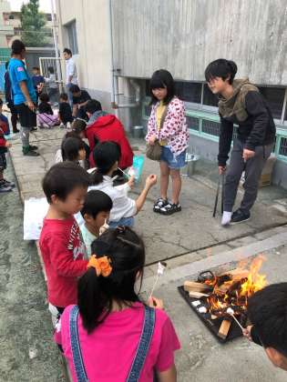 体育館外では、プレイパークせたがやの皆さんに教えてもらいながら、自分たちで火を起こし、お菓子を焼いて食べました。