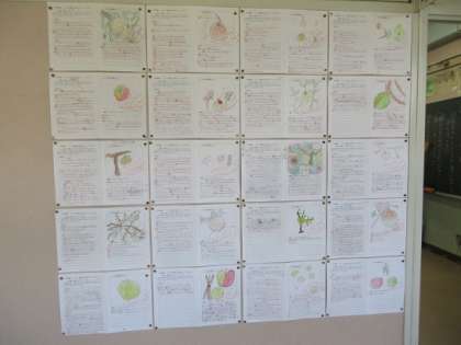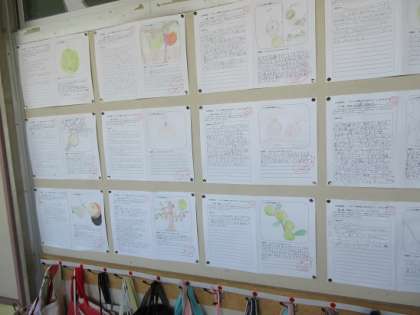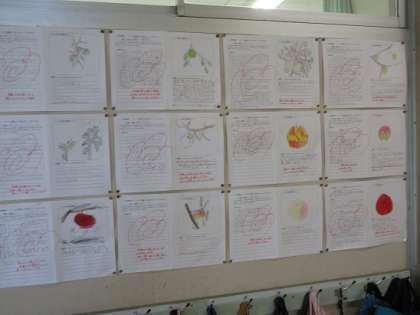 4年生の廊下の掲示板には、見学に出かけた内海農園のリンゴのことについてまとめたものが掲示されています。りんごの絵は、どれもおいしそうに描かれています。