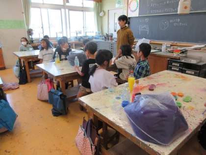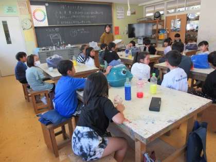 絵の具を混ぜて、不思議な色を作ります。混ぜすぎると黒に近づいてしまいます。