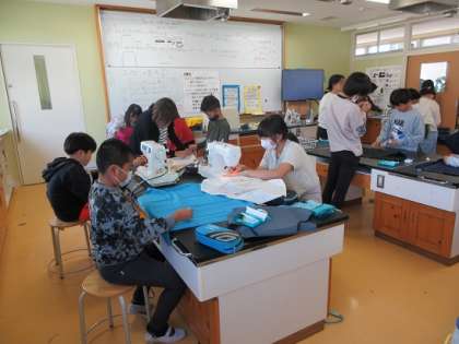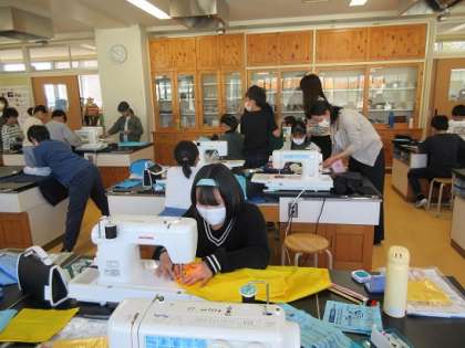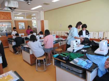 ミシンを使っての裁縫実習では、保護者の皆さんのサポートに助けられています。