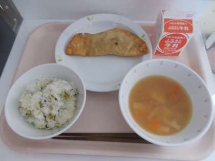 菜飯 ジャンボ餃子 中華風コーンスープ 牛乳