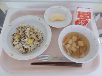 さつまいも入りひじきごはん 沢煮碗 くだもの(りんご) 牛乳