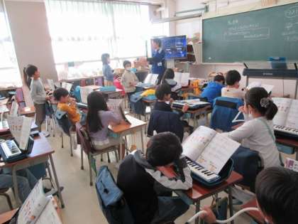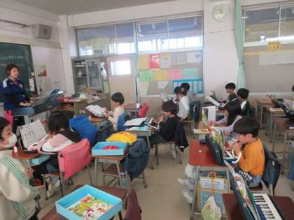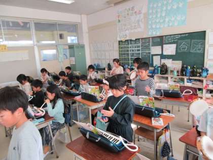 鍵盤ハーモニカにタンバリンとカスタネットを合わせて合奏です。