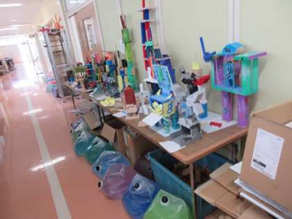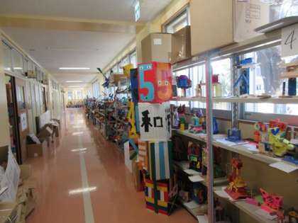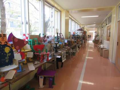 図工室の前だけではなく、東校舎の廊下には、展示を待つ作品たちでいっぱいです。