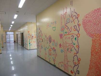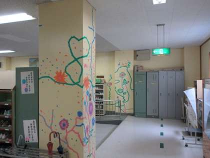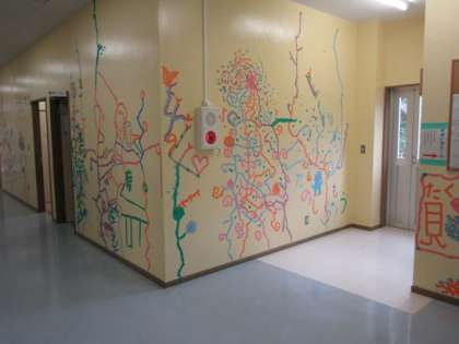 昇降口からBOP室の前、そして体育館へと、壁にはカラフルな装飾でつながっています。