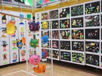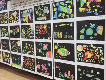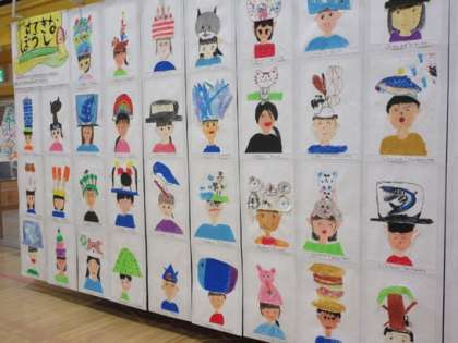 2年生の平面作品は、国語の学習を元にした帽子の絵とまるで版画のような黒と多色刷りあの模様です。子ども達が一生懸命に作っていたことが伝わってきます。