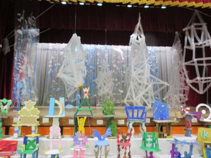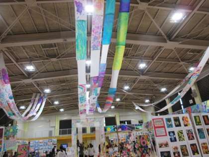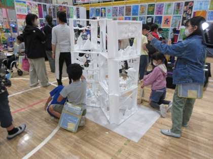 体育館の中には、学級や友達と協力して作った作品もたくさん展示しています。